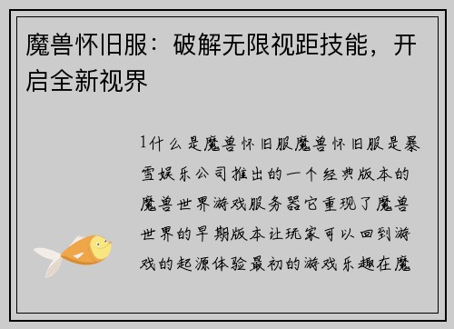 1. 什么是魔兽怀旧服 魔兽怀旧服是暴雪娱乐公司推出的一个经典版本的魔兽世界游戏服务器。它重现了魔兽世界的早期版本,让玩家可以回到游戏的起源,体验最初的游戏乐趣。在魔兽怀旧服中,视距是一个非常重要的技...